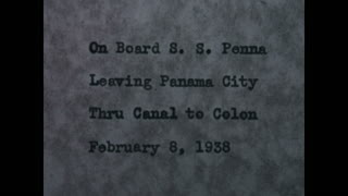 The film begins with two swimmers in a pool with a water polo sign (0:15), then cuts to passengers standing on a ship deck. A blurry statue can be seen in the distance (0:37). The camera quickly pans over houses and palm trees, people sitting by the side of a field, and rolling hills (0:54). A sloth at a zoo and a Spanish sign: “Adultos 25, ninos gratis cuando vengan acompanados por adultos” (1:04). “Bushmaster, World’s Largest Viper” sign (1:05). A toucan and other birds (1:07). Sign for short-keeled toucan (1:16). Dark, indistinct views of other animals in cages (1:47). Boats on the Panama Canal (2:17). The U.S. Las Cruces steamboat (2:42). One of the lock zones of the Canal (3:16). Title card: “Going thru the locks of the Canal to Colon and Cristobal. This is an eight hour journey” (3:42). Three men in hard hats waiting on shore (3:57). A line of men hauling up a rope (4:08). View from a ship as it goes through the locks (4:50). Green hillsides of the Canal (5:24); swimmers in the water. A narrow steamboat passes by (5:38). A woman pets a small black dog held by a man (6:02). Four sailors in white uniforms walk with a woman between them (6:07). Two women in dresses in a plaza walk toward the camera (6:16). A man dives into water (6:27). A Pan Am seaplane at anchor (6:35). “The Panama Canal Mt Hope Fuel Oil Handling Plant” sign (6:45). “The Texas Company Overseas Ltd.” sign (6:48). Fort Davis, Panama, 14th Infantry sign (6:50). Title card: “On board S.S. Penna leaving Panama City thru Canal to Colon. February 8, 1938” (6:58). The SS Pennsylvania ship (7:01). Title card: “Havana, Cuba, Feb. ’38” (7:17). The Havana Capitol building (7:18). A telecommunications building in the Old Town of Havana (7:31). “Florida New Haven Connecticut” sign (7:45). A graveyard behind a church (8:01); passengers disembark from a seaplane on the harbor (8:15). A crowd watches jockeys on Oriental Park Racetrack in Havana (9:54); Cuban and American flags (10:17). A blimp in the sky (10:40). PAA International Airport (11:08); sign saying, “Visitors Welcome, Pan American Airways System.” A crowd gathers to watch a seaplane, stamped with “FAA American Airways System” take off (11:27). “M&M Line” sign (11:48). The Pittsburgh Plate Glass Company (11:51). “Cruise-Way to New York Clyde-Mallory Lines” sign (11:53). U.S. Route 41 and Route 80 in Georgia signs (11:58). A man on a Greyhound Detroit bus (12:04). Natural Bridge State Park (12:07), as well as signs for Natural Bridge Hotel in Virginia and Endless Caverns in New Market, Virginia (12:24). A stewardess boards a Trans World Airlines (TWA) DC-3 airplane (12:28) before it takes off. The New York City skyline, with the Empire State Building visible (13:06). Monument to the USS Maine, which blew up in Havana Harbor (13:12). A Coca-Cola sign near Columbus Circle (13:18). More blurry skyline views and a busy sidewalk; Planters Peanuts sign (13:57). Sign commemorating the site of the first telegram, sent along the B&O Railroad on May 24, 1844 by Samuel Morse (14:09). The Chevrolet building (14:13). View out the window crossing a bridge in winter (14:40). Additional views of the Chevrolet firm (14:43), with an American flag on top. The Loews Hotel (14:55); Nut Club nightclub (14:57). Chevrolet building again (15:05). Lightbowns Tourists sign (15:11). A woman walks across the lawn to a car (15:21). George Washington’s Mount Vernon (15:35). The National Memorial Arch in Pennsylvania (15:37). Gettysburg, Pennsylvania, one of the battlefields of the U.S. Civil War (15:44). Family poses in front of a house and eats dinner together (16:10). Another view of the Chevrolet building (16:29). King George Cafe sign (16:52).