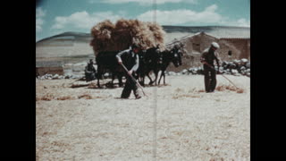 Parade of Giants and Bigheads in streets of San Fermin ahead of running of the bulls (0:23). Two Spanish women in traditional dress, lace shawls, lace hand fans (0:36). Older peasant woman rides on back of donkey (0:48). Shepherd leads sheep through pasture (0:56). Donkey operates Moorish Waterwheel (1:02). Panoramic view of rooftops, Cádiz, oldest city in Spain (1:12). Scenes from streets of Cadiz: Two men transport a couch, horse-drawn carriages (1:22). Camera pans view of homes in Granada (1:41). Alhambra, details of Moorish architecture and design in Court of the Myrtles (Patio de los Arrayanes), Court of the Lions (1:51). Troop of Andalusian Roma (Gypsies) dance Flamenco on street corner in old quarter of Albaicín (2:15). Barcelona: Panoramic view of Plaça de Catalunya, Banco Español de Credito building beside the plaza (2:59). Plaça de Francesc Macià (3:15). Two children feed bread crumbs to pigeons flocking in public square (3:27). Man drinks from communal botijo (búcaro) on city street (3:36). Camera pans Port of Barcelona, Spain’s most important harbor (3:44). Barcelona major point for import of textiles esp. cotton: Crane slowly lowers parcels of cotton from ship onto pier below (3:56). View of yellow cable car as it makes its way up mountainside to Montserrat Monastery, Santa Maria de Montserrat Abbey (4:10). Aerial view of Montserrat Monastery (4:25). Student monks walk through ancient city (4:40). Facade of Santa Iglesia Catedral Primada de Toledo (Great Cathedral of Toledo) (4:53). Traditional Toledo artisan focuses as he works precious metals into intricate floral design of Damascene box; Woman rotates in hand a finished example of a Damascene box featuring a Moorish-style design (pattern similar to Moroccan zellige tile work) (5:08). View of street in Seville, Giralda bell tower (5:35). Olive oil: Green of olive grove contrasts red soil of rolling hills; Farmer uses horse-drawn plow while another man handpicks olives from trees (5:53). Panoramic view of Valencia city skyline, Plaça de la Reina (6:11). Two farmers use ox-drawn plow to till soil (6:19). Basque farmers use traditional methods to farm, harvest crops like wheat (6:34). Man on ox-drawn reaper (6:47). Wine: Women harvest wine grapes, place them into wicker baskets (7:03). Cork: Two men strip cork oaks of bark; Ox pull wagon filled to top through cork forest at end of harvest day (7:18). Madrid: Plaza de Colón, Columbus Monument (7:48). Church of Saint Manuel and Saint Benedict (8:08). El Retiro Park (8:12). Pedestrian traffic along Puerta del Sol (8:18). Entrance for Madrid Metro (8:25). Metropolis Building at corner of Calle de Alcalá and Gran Vía (8:33). Traffic officer tries to direct traffic at bustling corner (8:41). Female vendor sells pastel-colored wafers from cart, another pedlar sells lottery tickets (8:49). Puerta de Alcalá (8:59). Royal Palace of Madrid (9:08). Equestrian statue, Monument of Philip IV of Spain by Diego Velázquez (9:15). Modernist architecture buildings at University of Madrid (9:23). Packed stands at football stadium, football match (9:46). Las Ventas Bullring (Plaza de Toros Las Ventas) (10:10). Inside bullring, matador puts on performance with bull (10:16). Troup performs traditional Mallorcan folk dance, traditional instruments like guitarra de canya (10:31). The End (11:09).