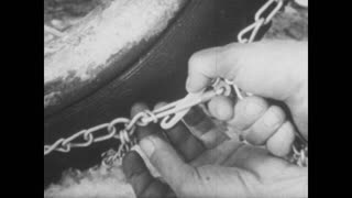 The film starts with a demonstration of placing track chains with adjustable tension. At 1:07, chains are clamped to the wheels of a truck, the truck driven forward and the chain is installed. At 2:14, installation of chains without tension brackets is shown, with a car as subject. At 3:30, the film demonstrates how a chain can be partially installed on a stuck wheel, to provide traction to escape a pothole or low traction situation. At 4:08, installation of chains on a Kdf wagon or Volkswagen Typ 87 is shown. (This vehicle was also known as the Kommandeurswagen, and it is a World War II, four-wheel-drive version of the Volkswagen Beetle. It was produced from 1941 to 1944 by the Volkswagen plant, primarily for high officers of the Wehrmacht.) At 4:30, a chain is put down with the Typ 87’s metal rope used to connect it, for anti-skid purposes. Chains can also be installed without this. At 6:11, a military motorcycle has chains installed. At 7:15, chains are shown installed on a large diesel truck with dual rear wheels, aka dually or DRW. At 10:30, a connection is made to turn the chain into a “track” that spans both sets of rear wheels on the truck, so it becomes almost like a half-track. At 12:05, repair of a broken chain link is shown using a spare tire. At 12:42 a title card states, “With such anti-skid chains you can drive well and safely!” A snowplow is shown using chains followed by shots of a Volkswagen or possibly a Mercedes-Benz type 320 WK Kübelwagen, and a motorcycle moving swiftly through the snow. At 14:30, a Volkswagen Kübelwagen is shown stuck in heavy snow. The titles advise releasing air in the tires when the traction situation becomes difficult. At 15:13, air is pumped back into the tires. At 15:30, an Einheits-Diesel truck is shown on the move. (The Einheitsdiesel is a standardized truck developed for the German Wehrmacht ahead of World War II. It was built until 1940 and used throughout the war.) At 15:58 a Tatra 81 heavy-duty truck (model made by Czech manufacturer Tatra between 1940 and 1942) is shown followed by a Skoda 256G.